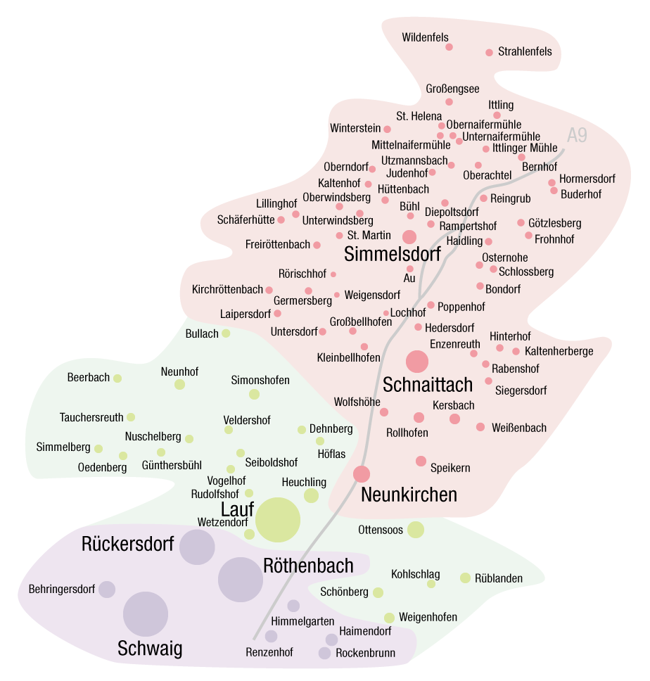 Behringersdorf, Haimendorf, Himmelgarten, Renzenhof, Rockenbrunn, Röthenbach, Rückersdorf, Schwaig